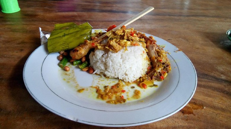 Di balik tempatnya yang sederhana, Warung Nasi Ayam Ibu Oki menyampaikan menu nasi ayam komplit. Sepiring nasi dilengkapi dengan ayam goreng dengan rempah khasnya, sate lilit, ayam rebus dengan sambal, hingga kacang panjang dan kacang tanah.